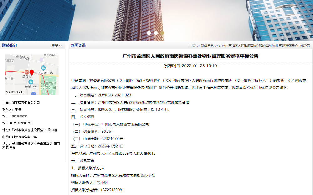 鼎點(diǎn)娛樂工程咨詢有限公司(以下簡(jiǎn)稱“招標(biāo)代理機(jī)構(gòu)”)受廣州市黃埔區(qū)人民政府南崗街道辦事處 (以下簡(jiǎn)稱“招標(biāo)人”)的委托,對(duì)廣州市黃埔區(qū)人民政府南崗街道辦事處物業(yè)管理服務(wù)資格項(xiàng)目”進(jìn)行公開遴選采購(gòu)。現(xiàn)評(píng)審工作已圓滿結(jié)束,現(xiàn)就本次招標(biāo)的中標(biāo)結(jié)果公告如下:一、項(xiàng)目編號(hào):ZDYRGD-2021-023二、項(xiàng)目名[詳細(xì)]